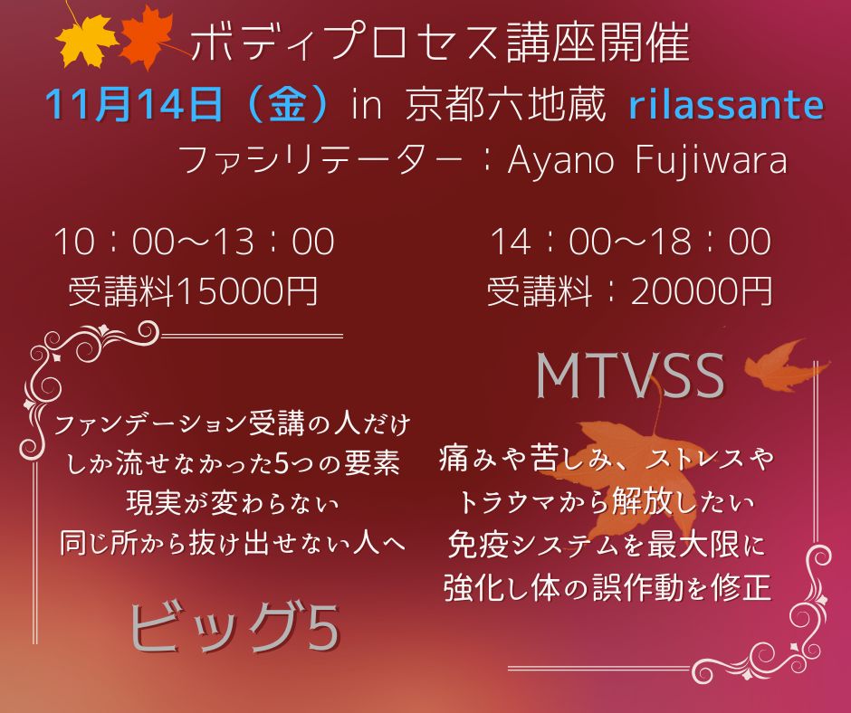 秋の習い事ボディプロセス講座開催 2025.11.04 お申し込みはrilassante公式ページまで。 202511月のBDクーポン 前の記事 新メニュー エネルギーワークボディプロセス「ビッグ5」「MTVSS」 次の記事