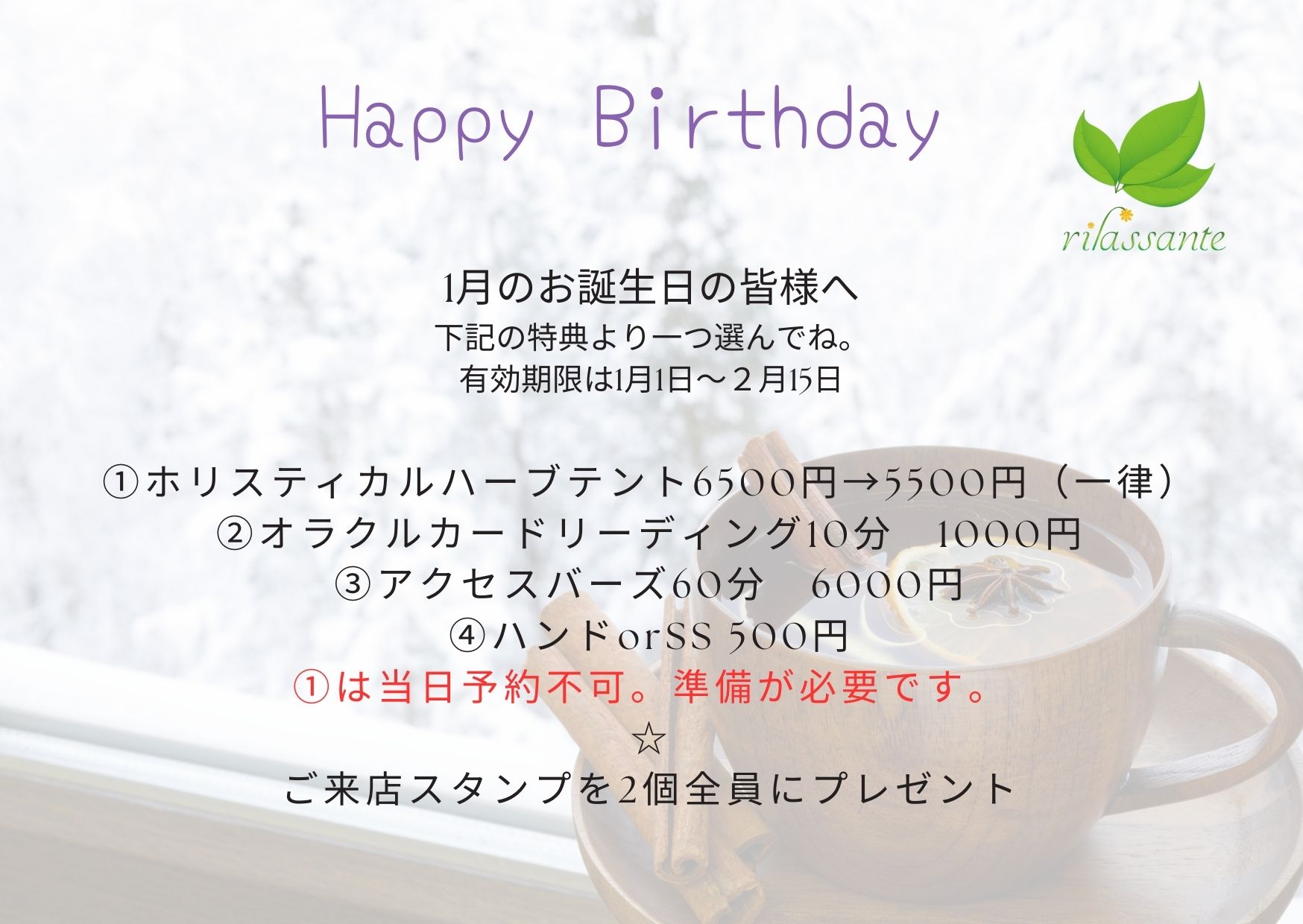 2026年1月のBDカードクーポン 2026.01.15 あけましておめでとうございます。 本年もよろしくお願いします。 遅れましたが1月のBDクーポンを配信します。 遅れた分期限を延長しました。 御予約時に提示かお知らせ下さい。お申し出がないと使用できません。 2025年12月のBDクーポン発行しました 前の記事 エネルギーワークメニュー90分以上の価格改定(キャンペーン終了) 次の記事